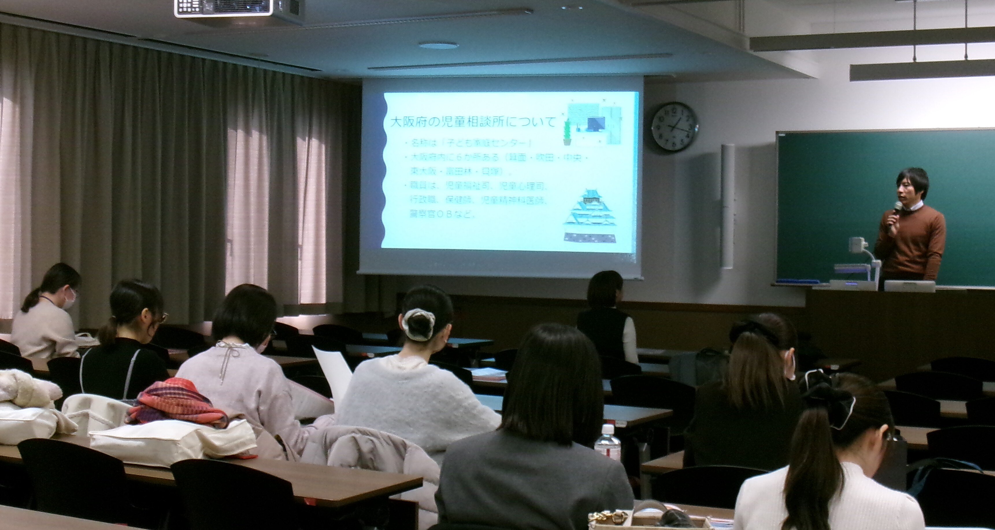 大阪府内の児童相談所の組織体制、心理職の業務内容、充実した研修制度や職場の雰囲気など、様々な内容を丁寧にご説明いただいたほか、職場で求められる姿勢や専門職としての心構えにも触れてくださり、参加した学生にとって大変有意義な時間となったことと思います。また、講師のお一人は本学の卒業生でもあり、現場で感じたことを率直に伝えてくださるその言葉から、刺激を受けた学生もいたのではないでしょうか。